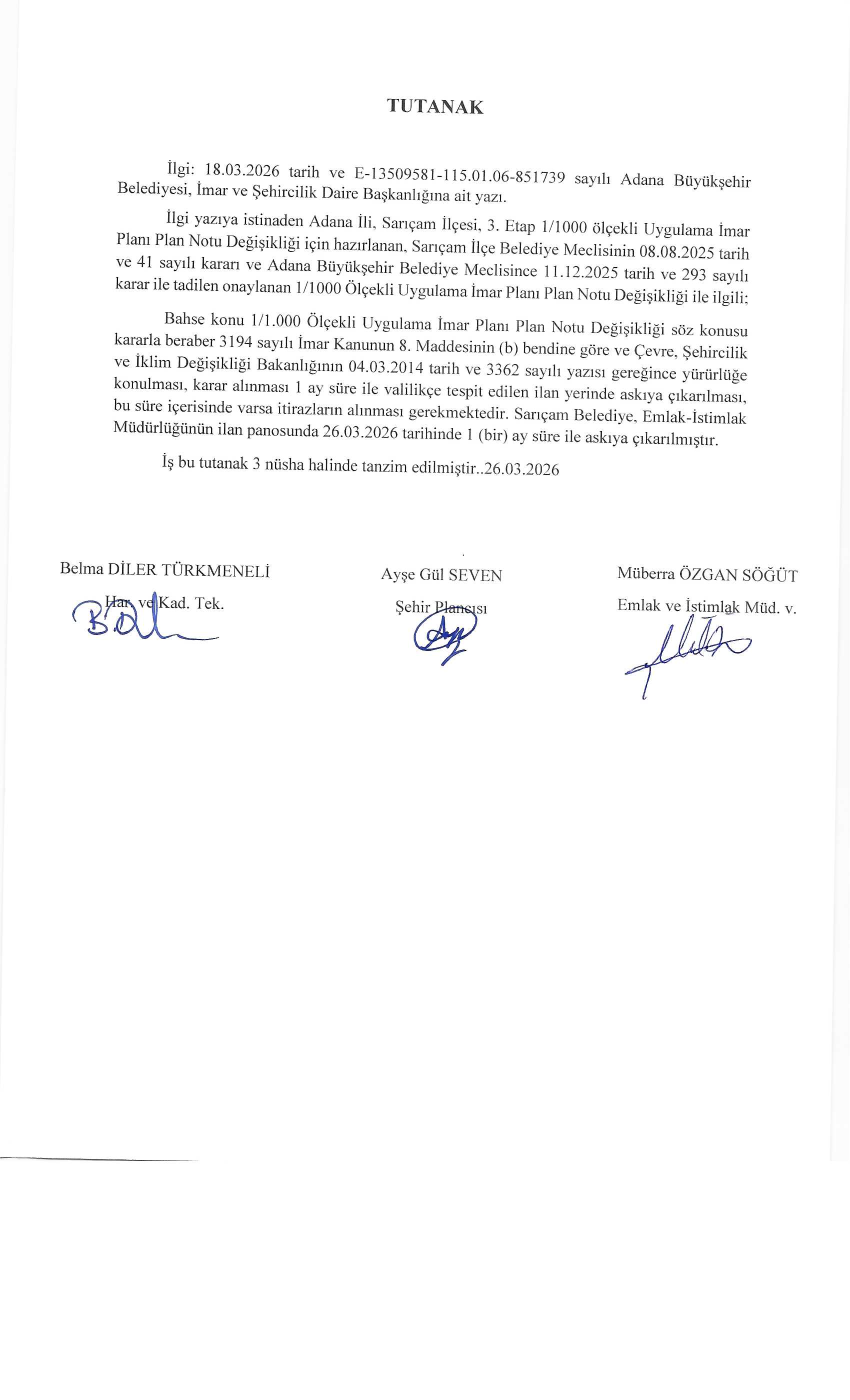 Adana İli, Sarıçam İlçesi 3. Etap 1/1.000 Ölçekli Uygulama İmar Planı Plan Notu değişikliği