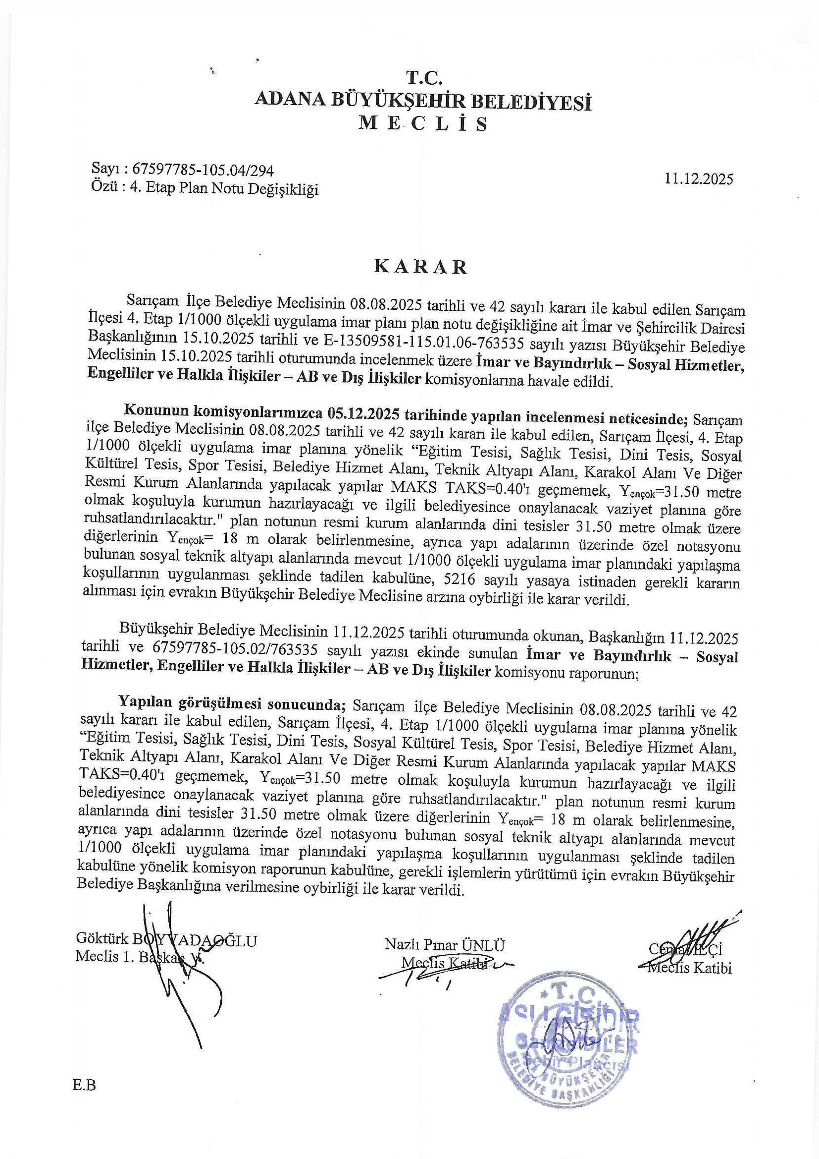 Adana İli, Sarıçam İlçesi 4. Etap 1/1.000 Ölçekli Uygulama İmar Planı Plan Notu değişikliği