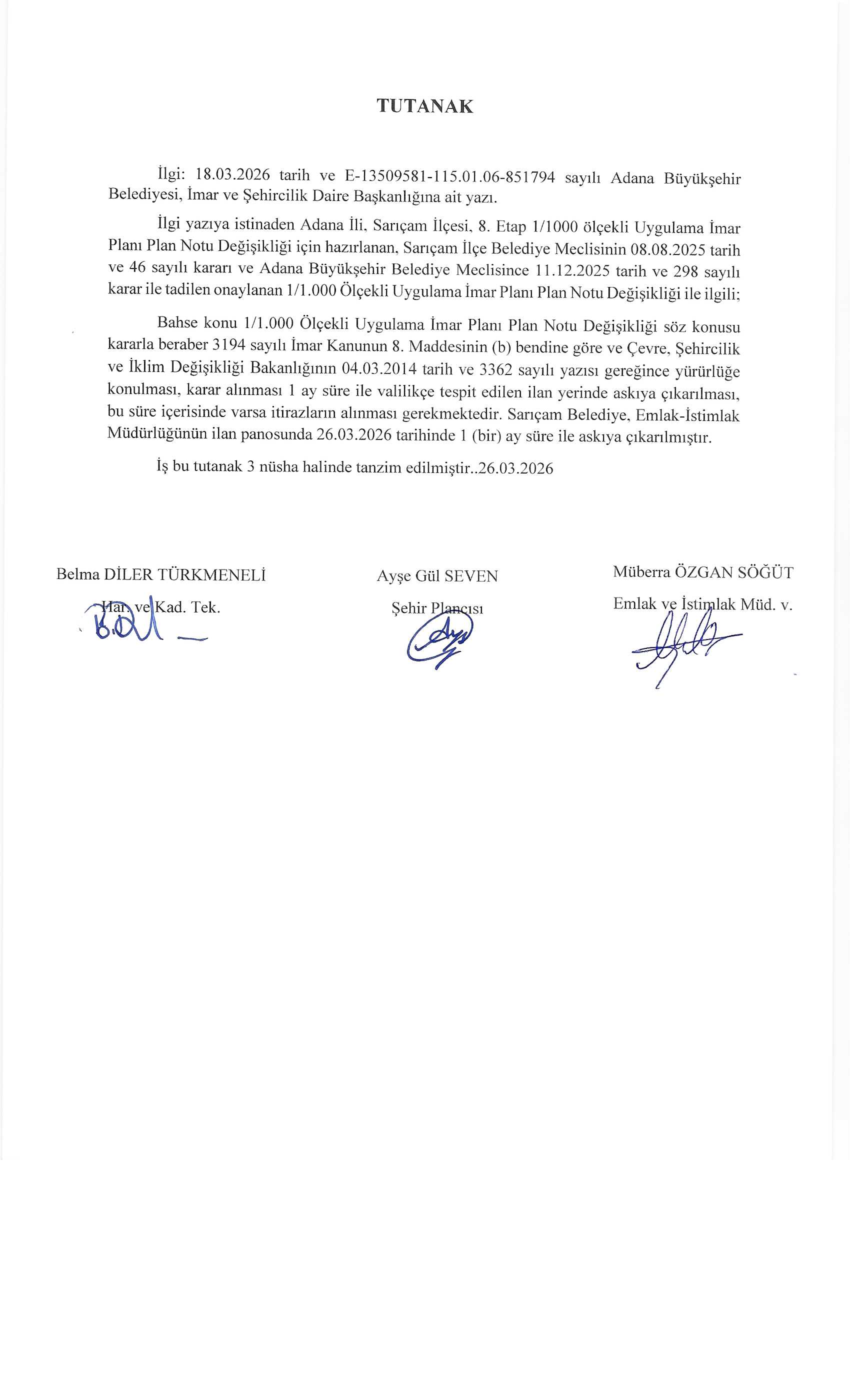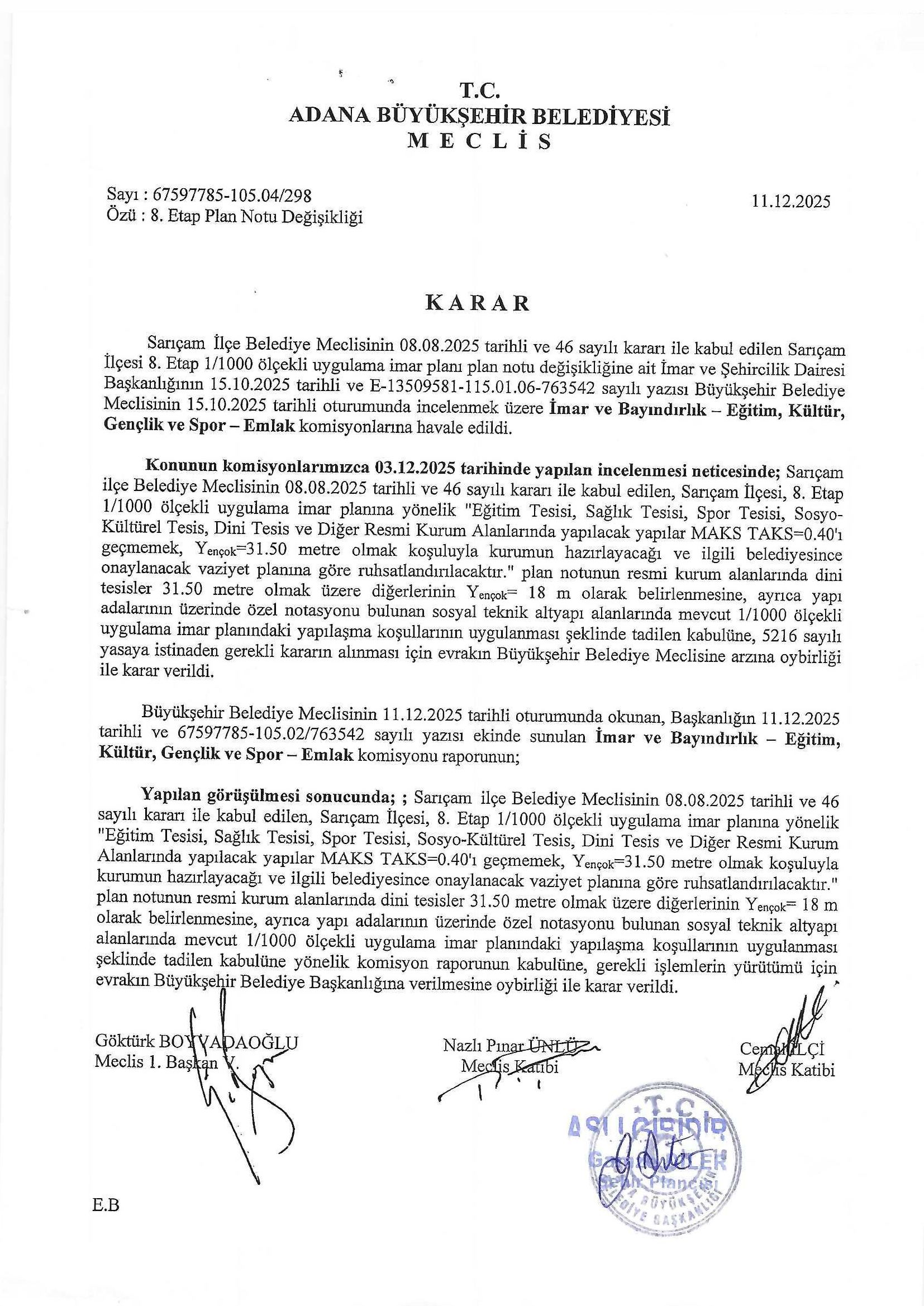 Adana İli, Sarıçam İlçesi 8. Etap 1/1.000 Ölçekli Uygulama İmar Planı Plan Notu değişikliği