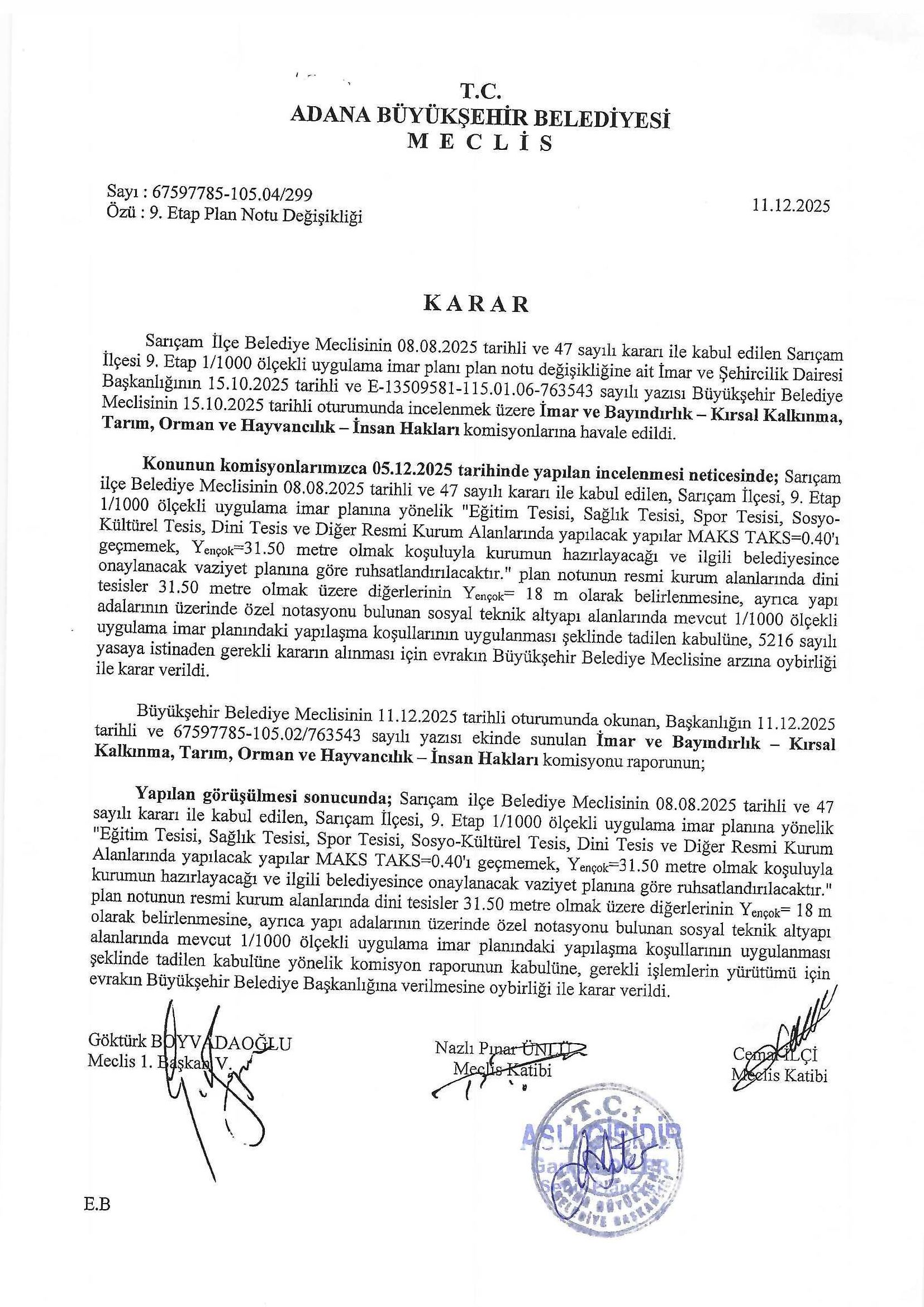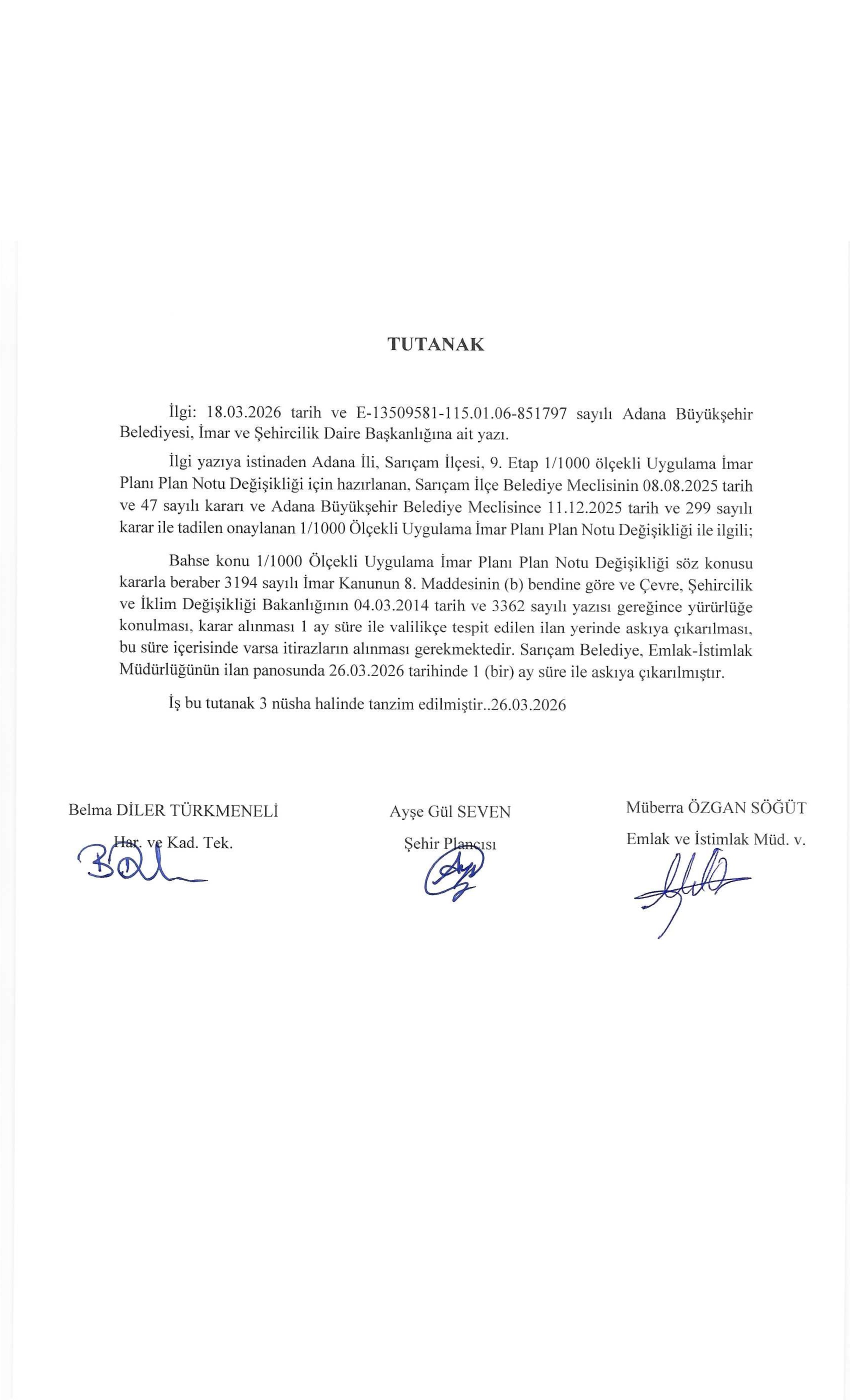 Adana İli, Sarıçam İlçesi 9. Etap 1/1.000 Ölçekli Uygulama İmar Planı Plan Notu değişikliği